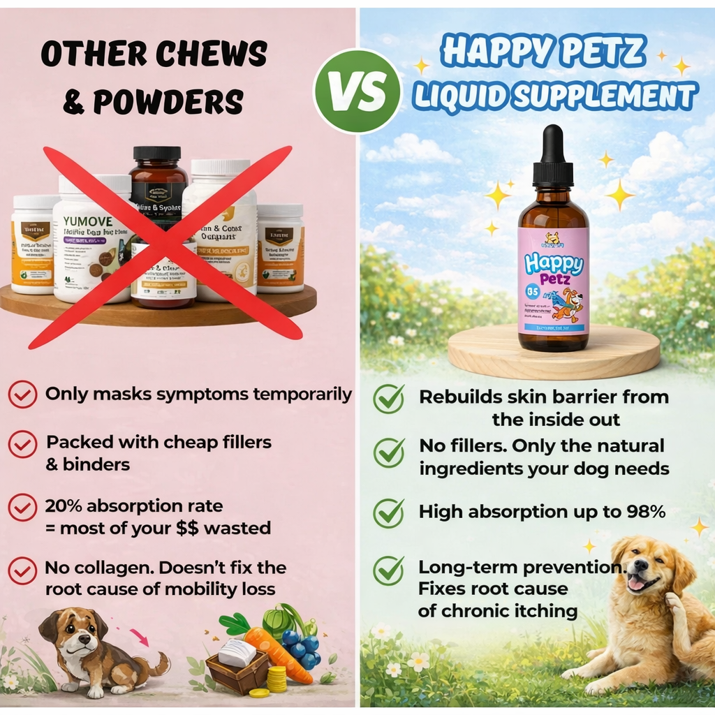 Today, 50,000+ dogs experience stronger, healthier skin with Happy Petz Liquid Collagen—addressing chronic itching, hot spots, and ear infections at the source.